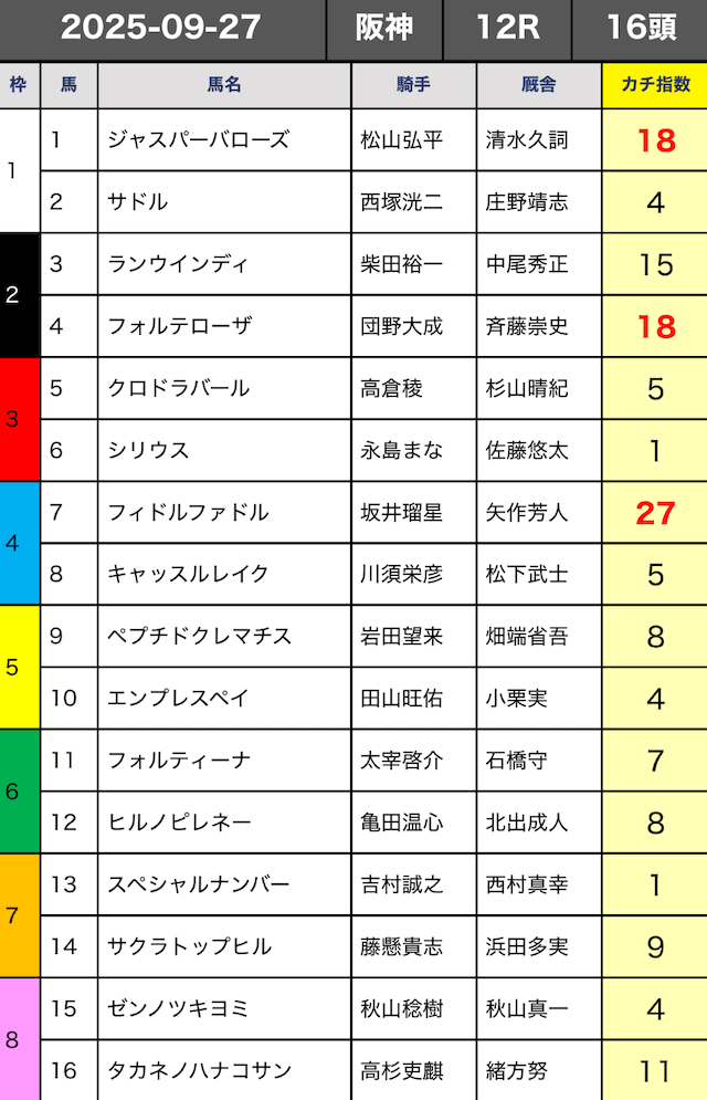 口コミにカチケンのAI予想のお勧めの使い方が書いてあって、9月27日土曜日の予想で、カチケン指数10以上の馬で馬券構成すれば当たる説、的中しました。1-3-16決着で馬券代10,000円。217,200円払い戻し、207,200円利益。まじで助かる。