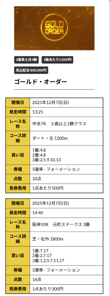 12/7のゴールドオーダー日曜日結果です。中京7R→10万馬券的中。阪神10R→不的中。結果50万利益。結構穴目狙ってくるんだなと思いました。