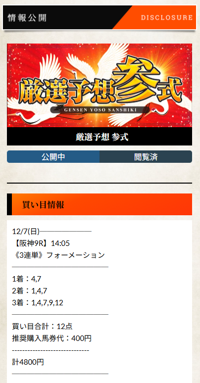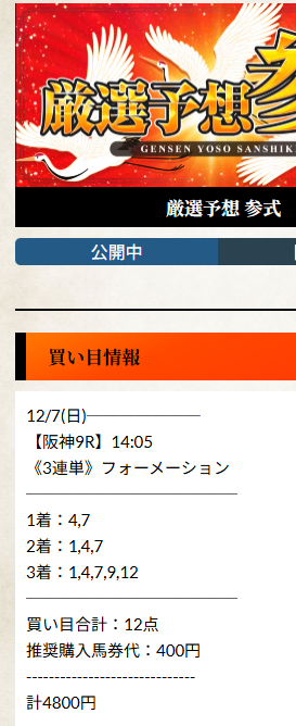 口コミに多かった厳選予想参式、先週の12/6.7の土日分買ったら7日当たりました。31万👍