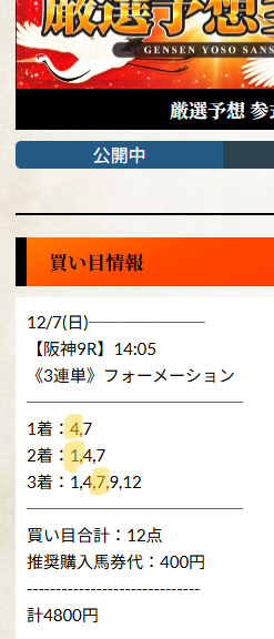 12/7 阪神9レース 3連単12点(1点400円=馬券代4800円)791.8倍的中 316,720円的中